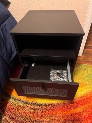 Mid-century style defines this versatile nightstand that can function as an accent table anywhere in the home. Made from durable engineered wood, this side table features powder coated metal framed legs with plastic floor glides. A generous storage drawer adorned with rattan accents is paired with an upper shelf for exceptional utility. Strong, functional and stylish, this dynamic bedside table is the ideal accompaniment in modern homes.