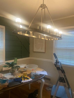 [This review was collected as part of a promotion.] This type of chandelier is made for folks with a large dining room area, preferably with very high ceilings. If you have a typical sized dining room with regular ceiling, it feels out of place. It feels out of place with the size not the quality. The quality reminds me of mid tier ikea furniture. It takes 2 people to install, one needs to be a man because although this is only 20lbs it feel like 50 lbs especially when installing. I am 5’4, it hangs at 5’6 in a standard sized dining/ceiling combo (with the shortest extension piece). Connecting the final pieces together, we literally had to spin the entire fixture because the screws aren’t opposing, so you can’t screw the top and the piece connected to the fixture. It was weird. It didn’t seem very level but that could be our ceiling fixture thing (as it sort of sways). Instructions were not clear, I wish they used pictures and words instead of a paragraph of confusing text, luckily we have installed many light fixtures before so we figured it out. It’s very bright, nice silver color.