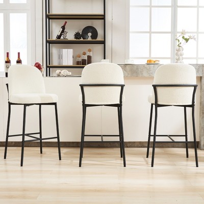 Modern upholstered bar stools will enhance and brighten up your bar or dining area. Featuring a durable ergonomic design, this set of 3 bar stools features a comfortable foam seat upholstered in soft, skin-friendly teddy fabric and filled with 3.54" thick high-density foam with a curved back to provide a comfortable touch. Sleek black metal legs, elegantly contoured backrest and built-in footrest make these stools both stylish and comfortable.