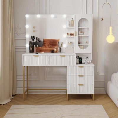 Acekool Vanity Desk with Mirror and Lights, Makeup Vanity Desk with Mirror, Adjustable 3 Color Lights, Chair, Charging Station, White