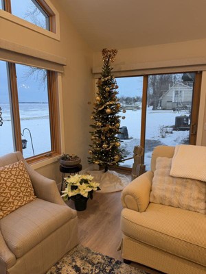 This tree is exactly what I needed for my bay window! I have a bay window that in the front of my house and I did not want to overwhelm the room. It is narrow enough to fit in the 3 windows but not so full it impedes on walking around the dining room table.