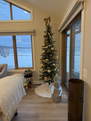 This is a great choice for a home with limited space for a tree. I have it sitting in a 24 inch (24 inch at the bottom) tree collar. I got it after Christmas, but set it up and fluffed it to make sure it was ok. Mine is the fairy lights option. Generous amount of lights, not quite as yellow as incandescent lights, but close. Lights seem to be well dispersed around the tree. Branches are very nice and well placed, this is not designed to be a super full tree, but is a nice approach to a more minamilistic tree without a sparse appearance. A little difficult to fluff because of the lights, but I was happy with the end result. Branches are not hinged, I'm hoping this won't affect the longevity of the tree. I'm not a fan of how the lights connect, the connections need to be hidden towards the back, I also found the connections somewhat confusing, but once lit, it looks great. This is the reason for four stars instead of five). I love the 7.5ft height, really makes you forget that it's a skinny tree! Overall shape of the tree is very nice indeed. I have to disagree with reviews that say the branches look fake, I think they look very realistic, the overall shape of the tree also contributes to a realistic appearance. I'm pleased with my purchase, though I don't think I'd pay full asking price. I will update if I encounter any problems.