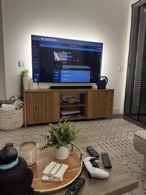 [This review was collected as part of a promotion.] TV stand has great potential, love the real wood look and feel, would fit in with some earthy décor! Good amount of storage for things you want hidden.