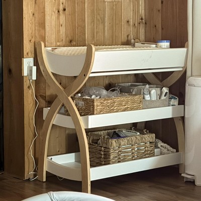 I am absolutely in love with this changing table! The design is modern yet warm, and it fits perfectly into our nursery. The natural wood accents add such a beautiful touch, and the curved lines make it look so elegant and unique compared to standard changing tables. It feels incredibly sturdy and well-built — I feel totally confident using it for my baby. The two spacious shelves underneath will be perfect for storing diapers, wipes, extra clothes, and all those little baby essentials you need within reach. Assembly was quick and easy, and you can tell the quality is excellent. It’s the perfect blend of style and practicality. If you’re looking for a changing table that’s functional, stylish, and durable, I can’t recommend this one enough — it’s truly one of my favorite nursery purchases!