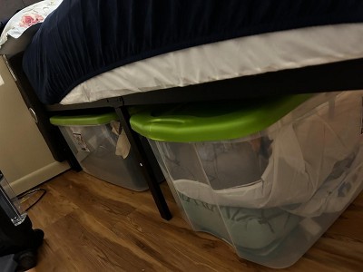 Like the height. It’s not a true 18”. I was a pain to put together with just an Allen wrench and lil gear tool that slips every time u turn it. I ended up using a drill and a bit that fit the screw and holding the other wrench and drilling at the same time. The package arrived out of shape not on seller but FedEx. It took me 3 hours to put it together. It fit bins 15” height no problem but 17.5” bins is an issue. U can lift the bed to put it under but you cannot maneuver it afterwards. Pics included. Excuse the lil gray kitty, he likes it under there lol.