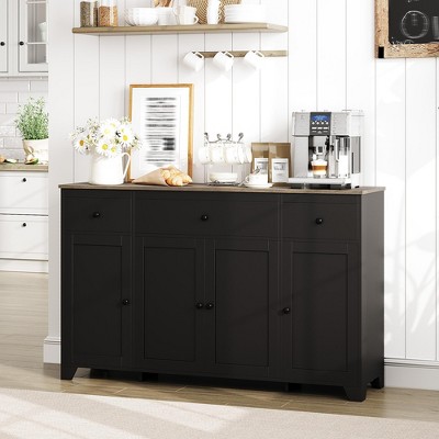 55" Sideboard Buffet Cabinet, Wood Coffee Bar Cabinet with 3 Drawers & Adjustable Shelves, Entryway Console Table, Floor Cupboard Cabinet Black
