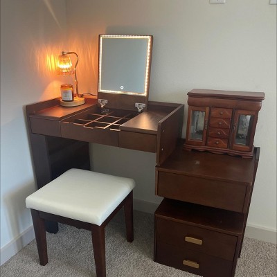 It comes in almost 50 pieces plus hardware. Directions are good. The quality of the surfaces is so poor. It came dirty and scuffed and one drawer deck has a chunk broken off the edge of the drawer front. As the surfaces are touched at all it gets scuffed more. The nightstand part slides in and out as it gets scuffed by the base part that sits on it! I added felt tape to prevent that from happening more. And mounting the lid/mirror is a nightmare because there are 4 tiny dots as suggestions for where to put the screws, and if you follow the suggested dots the lid sits too low. And it's pretty impossible to get the tiny screws in with a screwdriver with no holes started, you need a screw gun. I expected better for the price. I'm keeping it because it'll be a pain to return and I do like the compact size of it. I feel it should be priced lower though
