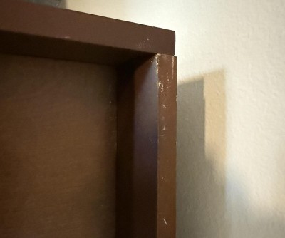 Can with multiple dents in wood and a drawer that doesn’t close. Cute design but very cheap materials