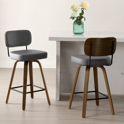 Bekrvio 26" Counter Height Bar Stools Set of 2 - PU Leather Swivel, L Shape Back & Bentwood Legs,Mid-Century Modern Kitchen Counter Chairs,Grey