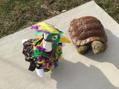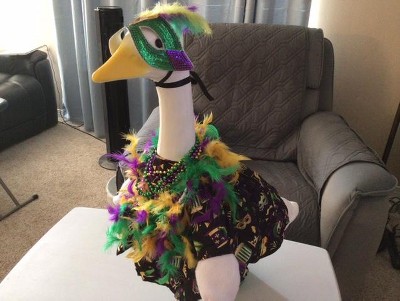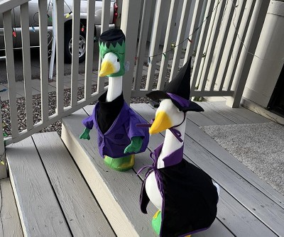 While the goose is absolutely adorable, I am disappointed to see that some of his beak paint had rubbed off due to lack of packaging material. I ordered another goose off Amazon and it was packaged so well and the goose was in great shape. The goose is a lot of fun to dress up- and I do recommend getting one. The Monster is from Target and the Witch is from Amazon.