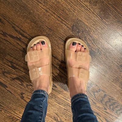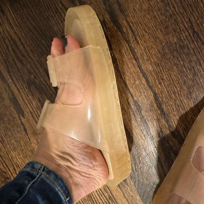 I’m 5’9” and 130lbs with a size 9 shoe. I bought these slides for the beach, and the pool for when we go camping. I’m very pleasantly surprised with how comfortable and supportive these slides are. The sole of the shoe is very cushiony. I like the clear plastic because it matches anything you wear. These are not only stylish but they’re also comfortable and functional and easy to slide on. I didn’t even have to adjust the buckle.