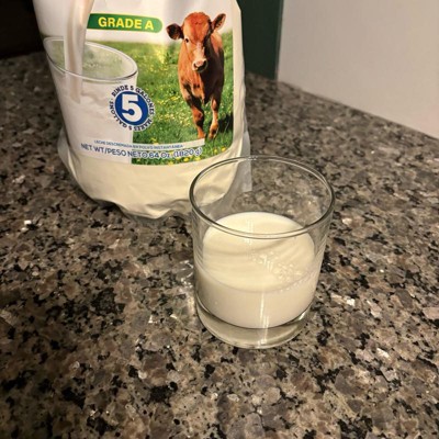 Mix 2 tablespoons (16–22 g) of powder milk with water to make 1 cup (240 ml) of milk. Approximate yield is ~5.8 gallons per 64 oz pouch when mixed to standard strength.* Store unopened pouch in a cool, dry place, reseal tightly after use, and refrigerate prepared milk. *Actual yield varies with preferred mixing strength.
