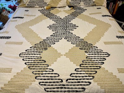 [This review was collected as part of a promotion.] I was so excited when the delivery truck arrived today! I couldn't wait to open this set. My pictures are straight out of the bag, which is super cute BTW. Love the little buttons! I didn't however put the insert in yet bc I couldn't wait to see it on my bed. However the button coverage to secure the insert is adorable. But yall, this is my favorite. The colors are beautiful and the stitch work... stunning. I love the tassels and check out the picture for where it hangs. Again PERFECT. I will say I only have a king not a Cal king but it is a perfect fit. Also it is an off white not stark white, which I was hoping for off white like rhe photos. I cant say enough wonderful things about this set.
