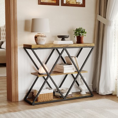 VECELO Vintage Console Side Table with Drawers, Sofa Table with Rectangle Shelves, X-Frame Design, Brown