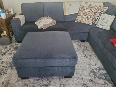 Fits perfectly against the couch and creates a chaise but you can move it whereever you want! And it's seating on its own. We love the deep blue color as we were sick of grey. SO glad we splurged for this with the matching couch, it was so worth it. The kids can't stop talking about how great it looks! I do with it had storage, or an option for a storage version, but that would increase the cost and I do think, with how things are now, we might have skipped it anyway.