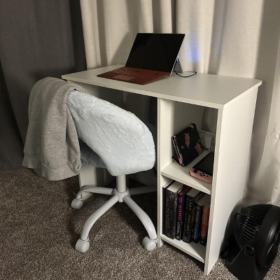 I got this computer desk to fit into my apartment and it\'s the perfect size. It has just enough room to fit a desktop screen and keyboard, and some odds and ends like a pen organizer. The open shelf doesn\'t fit my tower height wise so I have it sitting next to the desk. I\'m using the shelves to store files and mail, and they fit great and keep me organized. As far as putting it together, the instructions it came with were very clear and easy to follow. It didn\'t take very long to put it together and the only additional tools you need are a screwdriver.