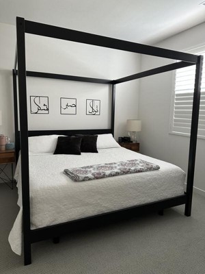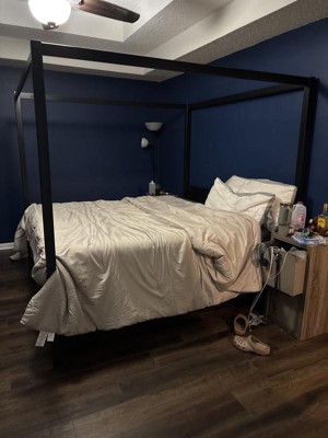 Design 10/10: This black, canopy bed is great for someone looking for a sleek, modern bed design. It’s sleek, modern design commands the room; however, it doesn’t overpower the room. Assembly 7/10 Assembled with one person. Took about 2-3 hours due to a few restarts. Boards are not labeled with stickers, which I love. Always struggle removing them. Labeling boards with arrows near the numbers would be GREAT. This would ensure all boards are facing the correct way the first time. Up arrows and down arrows. Few misaligned drill holes and ill sized dowels. One extra of each hardware would be great. Quality 9/10: So far so sturdy! lol. FRAME HEAVY DUTY. GREAT QUALITY Slats quality questionable… $ Value: 9/10: It’s a little pricey without the discount; however, it’s worth the discounted price! Overall: 8.8 Overall ALMOST PERFECT! I would purchase again. Glad I made the purchase.