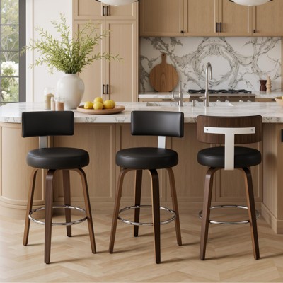 Whether you're spinning 360° smoothly to grab a bottle from the home bar for friends, leaning into the curved backrest to savor your late-night coffee without straining your waist, or wiping up syrup spills in seconds from the faux leather after a lazy weekend brunch—Bekrvio’s swivel counter height bar stools turn small daily moments into little luxuries. The high-elastic sponge cushion stays soft but firm, while black lacquer walnut-veneer legs and chrome accents add mid-century modern charm that fits right in, whether your space is rustic kitchen, sleek dining nook, or cozy pub corner. At 29" tall, it’s perfect for 40-43" tall tables, the armless design tucks neatly under tables to save space, and each stool supports up to 350 lbs with FSC-certified wood for legs and seat panels—so you get style, comfort, durability, and eco-friendly peace of mind all in one.