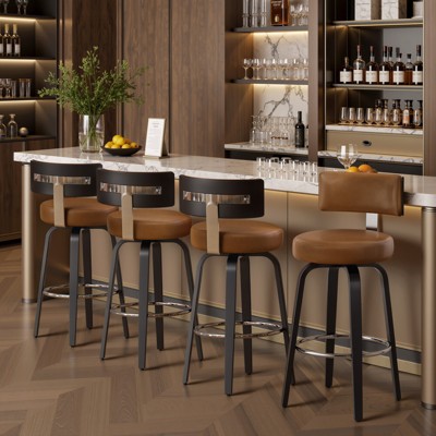 Bekrvio 26" Swivel Counter Height Bar Stools Set of 4 – Mid-Century Modern Upholstered PU Leather & Walnut Bentwood Legs, for Kitchen Island (Brown)