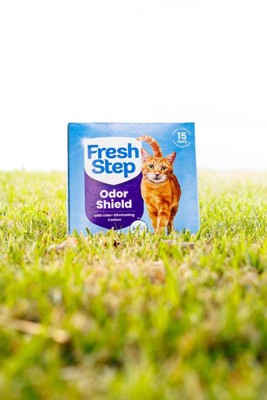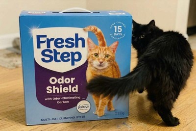 [This review was collected as part of a promotion.] I hate going into the bathroom and all you can smell is my cat's business. I used to buy semi-clumping, odorless, dust free litter sand but got tired of it not eliminating smells. So, in order to test the Fresh Step odor shield, i put it in a single use litter box on a trip, lining it up w plastic cover and whenever we're on the move, would fasten the plastic cover and put it in the back of the car. For three days, even without cleaning it, I smelled nothing in my car or in the hotel room!!! Even after my cat took a dump, after being buried, u wouldnt smell anything. This odor shielding feature must be the best in the market. Also, clumps really well, does not go into small pieces when picked up, odor shielding, and although a lil dust gets off when it's poured, my cat didnt sneeze and has no allergies towards it. (16year old cat)