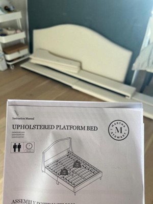 [This review was collected as part of a promotion.] This Upholstered Platform Bed is very big and chic! I love the texture of the curved headboard and the overall style. I will say it took a few hours to put together as the wood slats were not all the same length as they should be. Some were to short so the pre assembled holes didn’t line up correctly. The color is like a cream color so it gets dirty easily and is visible but if you take care of it you should be fine. Overall I still like the bed and it’s very aesthetically pleasing.