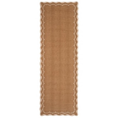 I am in love with this rug! The color is beautiful. The scalloped edge is very unique and elegant. The rug stays in place, no slipping at all. I highly recommend this great rug!