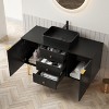 This bathroom vanity combines durable ceramic basin options with a sturdy freestanding cabinet for style and function. Featuring three basin choices, delicate six-layer paint door panels, and a stable multi-layer plywood body, it ensures durability and moisture resistance. With three drawers, two open compartments, and gold-tone legs, it offers ample storage and elegant design. Pre-assembled for easy installation, this vanity brings convenience and sophistication, creating a refined centerpiece in any bathroom.