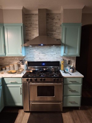 The chimney range hood is the perfect functional addition to my new kitchen. I love the dual lights and the variable speed fan.