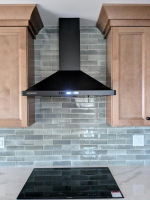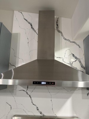 We recently installed this hood into our kitchen and we love it. We were a little worried about the top not being long enough but it came with enough give to fit our space and more. It goes beautifully with our new stove and backsplash.