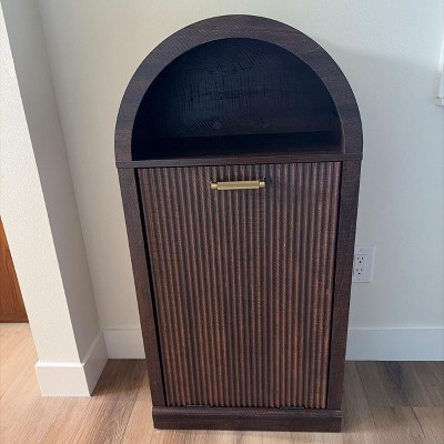 Modern Tilt-Out Trash Can Cabinet, Arched 10 Gallon Trash Can with Fluted Door & Open Shelf, Hidden Garbage Can for Kitchen, Living Room, Natural