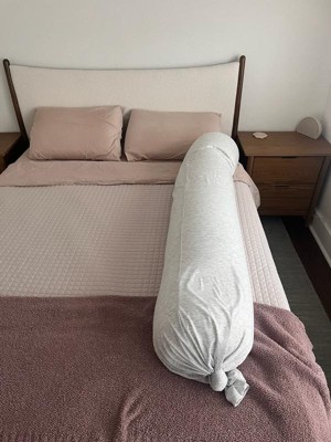 [This review was collected as part of a promotion.] This pillow is great! It’s very long (nearly the length of the bed) and the firmness is adjustable by tying the ends long or shorter. The filling is tiny beads so it’s very easy to shape this pillow to the way that you want it. They do have a bit of a plastic smell but I’m hoping that airs out. The cover can come off & be thrown in the machine for easy washing.