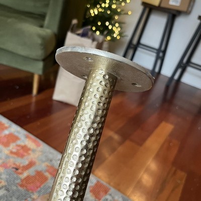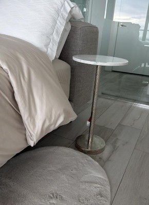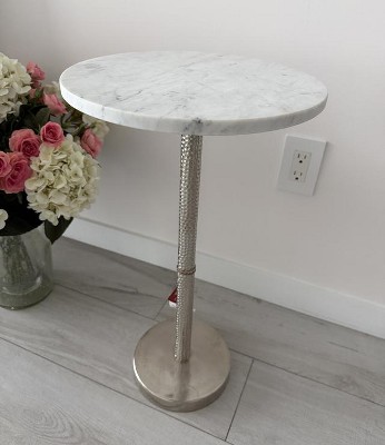 [This review was collected as part of a promotion.] This Sagebrook Home drink table is the perfect addition to our living room! It boasts a modern and polished look, adding a touch of sophistication to our decor. It is a beautiful looking accent piece, featuring a sturdy flat marble top, accompanied by a hammered steel base that will complement any color scheme. It comes in 3 separate pieces and assembly took about 30 seconds. It is 24” tall, which is almost level with a sofa arm rest. Assembled weight is approximately 15-20 lb. It feels like a very solid and well made piece of furniture. This is a great idea if you want a minimalistic look and do not want, nor have the space for larger end tables.