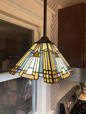 • Handcrafted Tiffany Glass Design: Classic geometric Arts & Crafts pattern features handcrafted art glass in sapphire blue, warm honey amber, and cream, creating beautiful light diffusion and authentic Craftsman character
