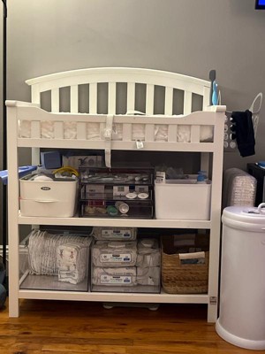 We absolutely love this Graco changing table! It’s the perfect height so we don’t strain our backs changing our twins and has tons of storage. I’m able to store all of the changing supplies and extra things we reach for on a daily basis. Highly recommend!