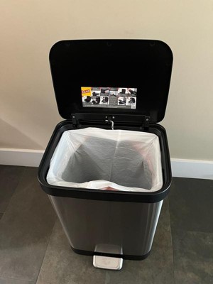 [This review was collected as part of a promotion.] I really like this trashcan! It has a sleek design and easy to wipe down the outside, the inside is a little trickier as all the components on the top make it harder to clean in the crevices. It is short but very wide which I prefer as trash fits in it better without making a mess. It closes well, and has stopped my dog from digging in it because you have to use the step for it to open. It’s quick and easy to add and remove the bag, I love the inside rods as it holds the bag in place well. Not a fan of the bag holder compartment, though I like the idea of it, every time I grab a new bag, they all come out out once. Otherwise, great trashcan!