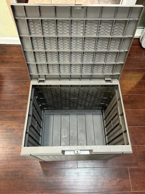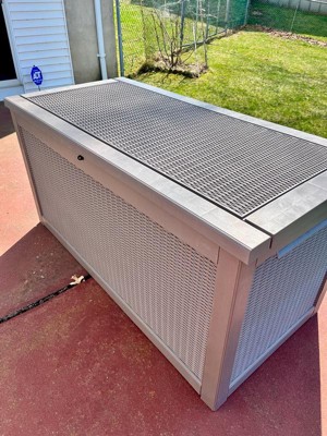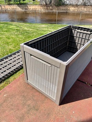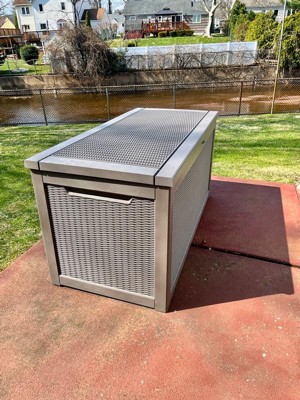 [This review was collected as part of a promotion.] This outdoor storage container is a perfect addition to my patio. I have two outdoor patio sets and an outdoor dinning table, with all my outdoor furniture, I have so many cushions and pillows. Having this storage container helps so much, it holds all my cushions, pillows and more, with its 260 gallon capacity, I never have to worry about running out of room. The container looks so beautiful with its basket weave design and the coffee color is perfect. It is made out of durable, long lasting resin. I love that I can keep this storage container outside all year long and never have to worry about uv and water damage. All the parts and pieces were included in the cardboard box the container came in, all I needed was a screw driver for the assembly of the side anchors and top spring attachment. Instructions were provided, but only images for the steps and no written directions, so getting started took a bit of time. Once I figured it all out, it was easy from there and then the assembly went quickly. When I finished assembling storage container, I did need help moving it to the area I want it. It is a heavy piece once it’s all built. Also, I did assemble the container outside because it would of never fit through my sliding glass door if it was fully assembled. The container doesn’t have any areas for ventilation so anyone purchasing this item, would have to keep this in mind. A latch is provided so we can lock this up if we choose. Overall I’m impressed by the quality and size of this storage container.