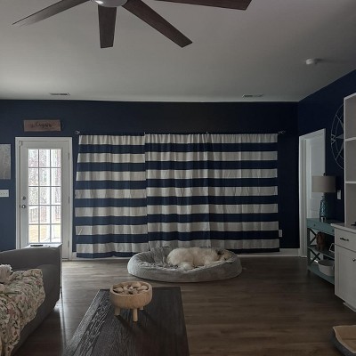 Stripe Navy Room Darkening Curtain Panels Bold horizontal stripes with a room-darkening weave to reduce light, noise, and heat. Easy rod-pocket header for smooth open and close. Soft, durable, and machine washable.