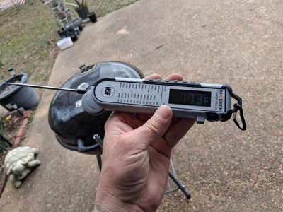 [This review was collected as part of a promotion.] This thermocouple thermometer from Maverick is really accurate which helps make it an essential tool when cooking meat. I really appreciate the cheat sheet underneath the display with the list of meat and temperatures. It's very helpful. It gets temperature readings super fast, and has a massive temperature range. The large auto shut off, Fahrenheit or Celsius display is easier to read at night than in sunny conditions, though. As much as I drop things, I am glad it is shock proof. What's even better about it is you don't have to be overly careful washing it and cooking on rainy days is not an issue as it is water resistant. This thing is already getting a lot of use, and it's safe to say that it is definitely worth having in the kitchen.