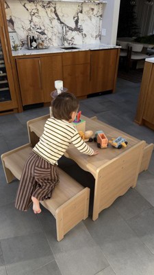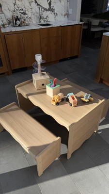 [This review was collected as part of a promotion.] This table and bench set has been the perfect addition to our school room! The table is so spacious for school work and crafts, and it is the perfect height for little learners. The color and wood detail is so beautiful as well!