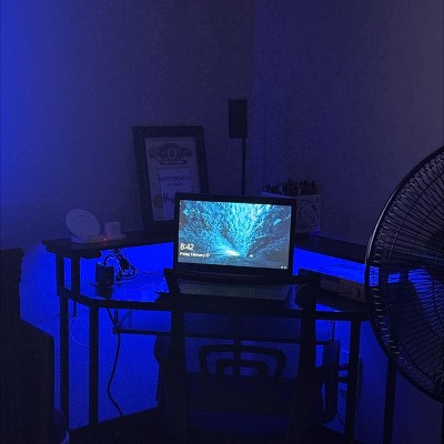 Greenstell Small Corner Computer Desk with Power Socket, LED Light Computer Desk with Monitor Stand, Keyboard Tray and Headphone Holder, White
