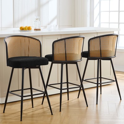 Bekrvio 29" Swivel Bar Stools Set of 3 with Rattan Back Solid Wood Legs, Faux Leather Upholstered Mid-Century Bar Chairs for Kitchen Island, Black