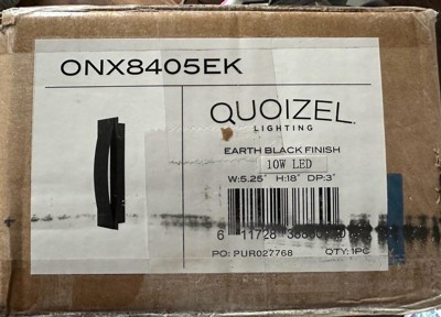 [This review was collected as part of a promotion.] The Onyx Integrated LED Black Outdoor Wall Lantern by Quoizel combines contemporary style with practical functionality.  Design: Its gently curved silhouette, finished in sophisticated earth black, is complemented by a unique textured front panel that resembles concrete, adding visual interest and dimension to the design.  Brightness: The integrated LED light source shines brightly through the sides, delivering 1200 lumens of warm 3000K light, providing ample illumination for outdoor spaces.  Durability: Constructed from durable steel, this fixture is built to last and offers a clean, polished look.  Weatherproof: Designed for outdoor use, it is weather-resistant, ensuring reliable performance in various weather conditions. Installation: The lantern is hardwired and comes with a 6-inch lead wire, making installation straightforward for most exterior walls.  Overall, the Onyx Integrated LED Black Outdoor Wall Lantern offers a blend of modern aesthetics and reliable performance, making it a great addition to any outdoor setting.