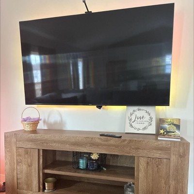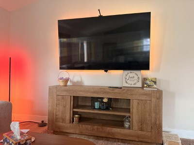 We’re really happy with this purchase. It’s fits our aesthetic and it’s a solid piece. We have a 75 inch TV and it’s slightly longer than it which is perfect. The cabinets are slow closing which is a nice touch. The only issue we had was that one of the wooden dowels went through the material when we were building (we didn’t notice until we finished). We’re not sure how it happened since it was a short dowel but it left a noticeable hole that raised the material up. Be more gentle than you’d think when building to avoid that. Overall 4/5 stars for us!