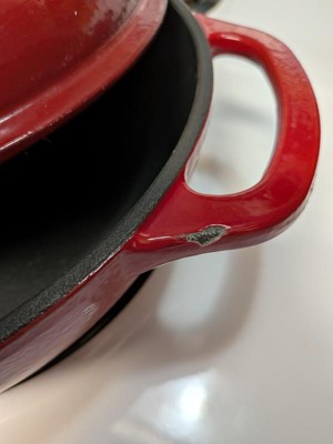 I wanted to fall in love entirely with this set and at first glance I did until I opened it all up and saw that the skillet already had a chip in the enamel on the handle and it made me just sick. It makes me wonder if it's all going to start chipping up like this. So if it's shipped to you that way you can only imagine what wear and tear will do so. I'm not really using the set now for fear that it's going to keep chipping up, and I'm sorry I can't leave a better review because it is an absolutely beautiful set. It is incredibly heavy to lift. If you're going to give it to somebody who's elderly or arthritic I would say no unless they have help because it is a very very heavy to lift set and once it's filled with ingredients it's only going to get heavier. It's an absolutely beautiful set though and I couldn't believe that there was a chip in it. I am going to have to address this with the company. We were gone after we got the set. Someone else had retrieved it for us and it was not unboxed at all but that's how we found it. Now that we're home and wanting to use it, we are very leery of doing that until we can address this issue with the manufacturer.