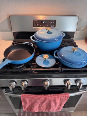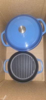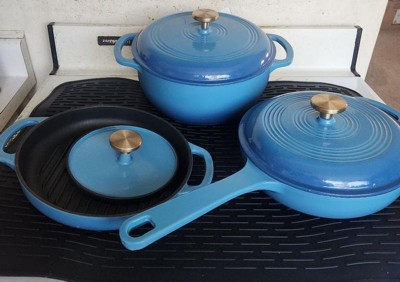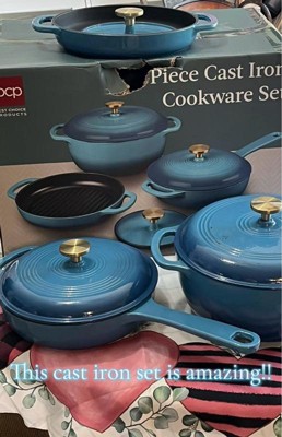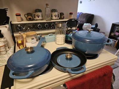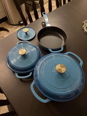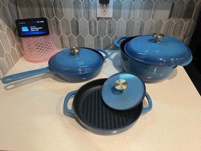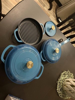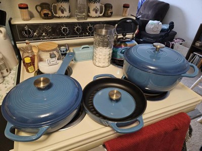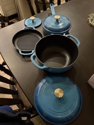 [This review was collected as part of a promotion.] I'm SO in love with this 6-piece cookware set!!! The blue enamel coating is super pretty, and it's nice and shiny. Everything is off such a great quality, so I'm impressed by the brand for sure! I love that everything came with lids. My Dad especially loves the heavy metal press! It was literally on my To Buy list, so that's awesome that it comes with one! It goes great with the ridged double-handled pan. If you want those awesome char lines on your steak, then this is the set to get! The weight of the products is great, too: not too heavy for being cast iron, which I find to be the only downfall. They heat up quick, cool down quick, and they cook food perfectly! When you're done, they sort of all stack together, so storage is nice and easy. I highly recommend checking out this or any other set, because this rocks! I love it SO much! ❤️