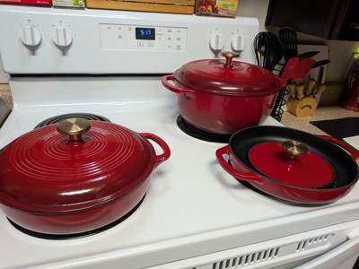 [This review was collected as part of a promotion.] This cast-iron cookware set is truly a dream come true! They are so adorable and high-quality each meal cooked with them comes out perfect exclamation with the grilled pan and press you can make your own delicious Panini or get a perfect your own vegetables! The Dutch oven cooked, my sourdough loaf perfectly exclamation, and the skillet gave me the fluffiest rice ever! I’ve cooked with these so many times now and have been so pleased each time! They cook evenly and no issues with sticking! They are chemical free and seriously a dream come true!!