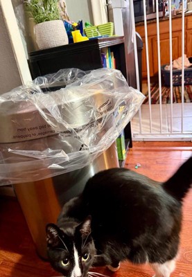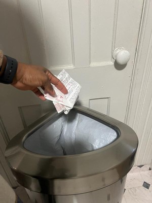 [This review was collected as part of a promotion.] I love this trash can! It holds a lot of trash which is very nice especially if you have kids. The material is nice and shiny. The trashcan is nice that you can put it in a corner of your house. I like the lid, but I wish I had to lid that closed. The height is nice. It’s not too big and it’s not too small. I have this trashcan in my kitchen and it fits perfectly. It has worked great for me and my family. The bags for the trashcan are easy to put inside. The trashcan bags stay in place, which is nice.