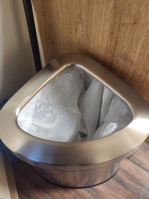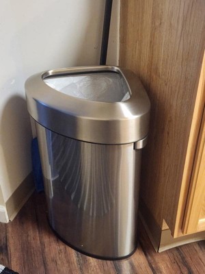 [This review was collected as part of a promotion.] This is the perfect sized corner trash can. Fits your standard trash bag perfectly. I love the open top design so you don’t have to touch any lids to open it. Very sturdy design and the stainless steel is sleek. The can itself is strong but not heavy which is nice because I can move it if I am reorganizing my space. It is versatile and matches any area and can be used at your business or at home. It is a big step above a traditional garbage can as this design is more appealing to the eye.
