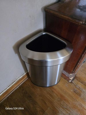 [This review was collected as part of a promotion.] This is exactly what my office was missing! This stainless stain triangular corner garbage can leaves a sleek clean look for my office. It is lightweight and fits a ton of garbage!