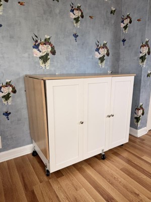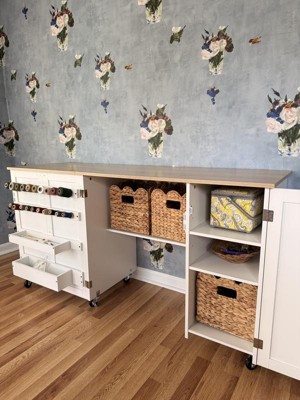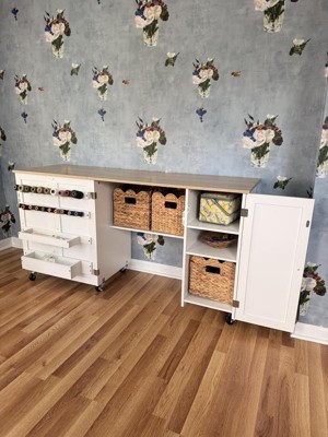 [This review was collected as part of a promotion.] I was gifted this product in exchange for my honest review. - this fold up, portable crafting table is everything ! It is really sturdy even when opened up. It has so much storage space with shelves and cubby baskets, and folds up easily to give you more floor space when not in use. It’s easy to move around since it’s on wheels and the wheels have locks so when you put it where you want it , it doesn’t wiggle around.